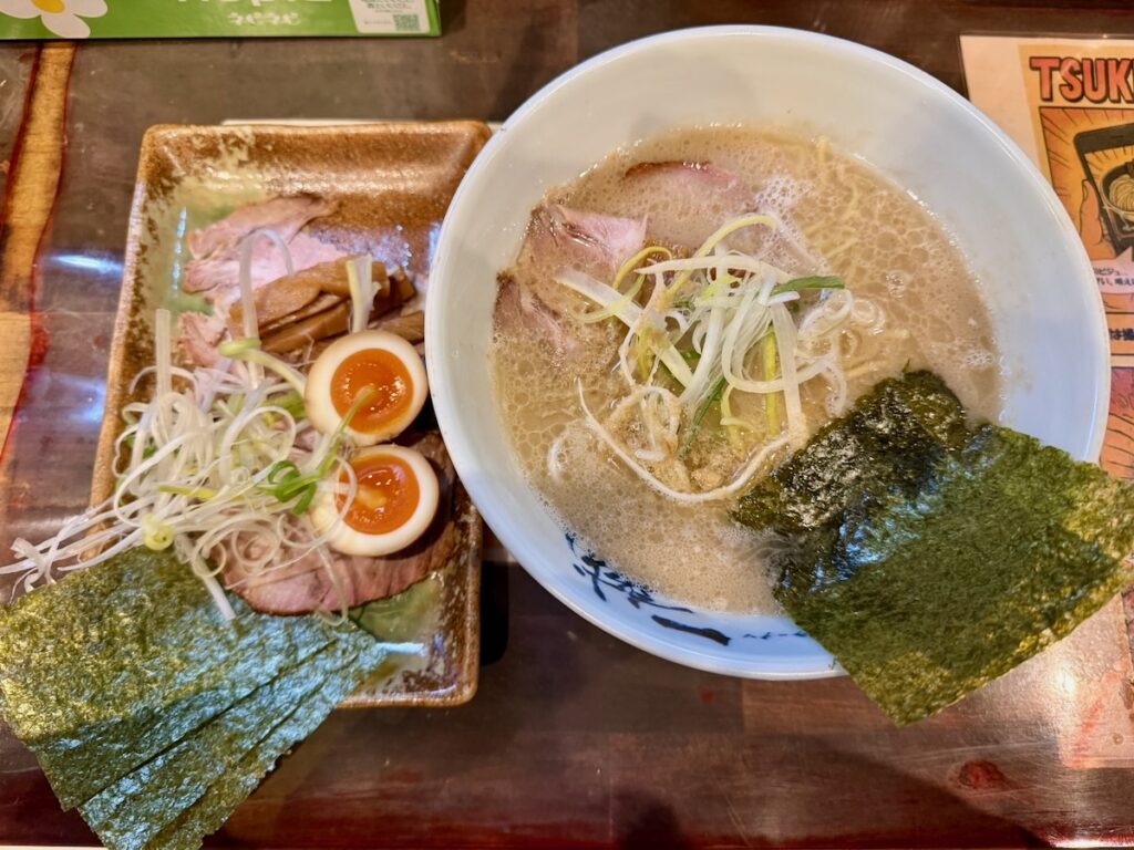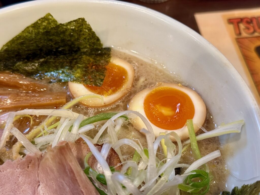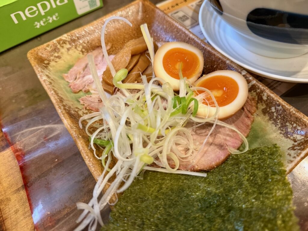 デフォルトで入ってる、ネギ、チャーシュー、海苔、メンマが追加されます。そして味玉も1/2が2つ
