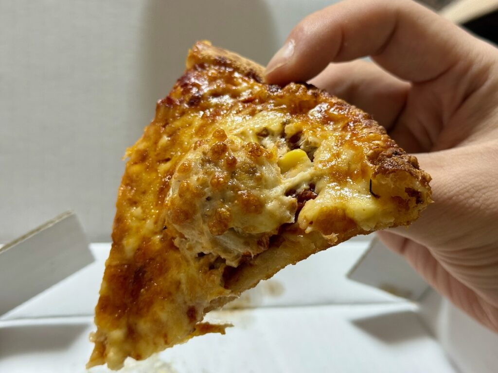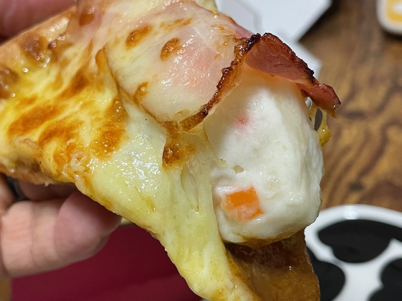 チーズがデロデロ。迂闊にとると、上の具が全部落ちてきそうなぐらい柔らかくてデロデロ。とろ〜りチーズが柔らかい
