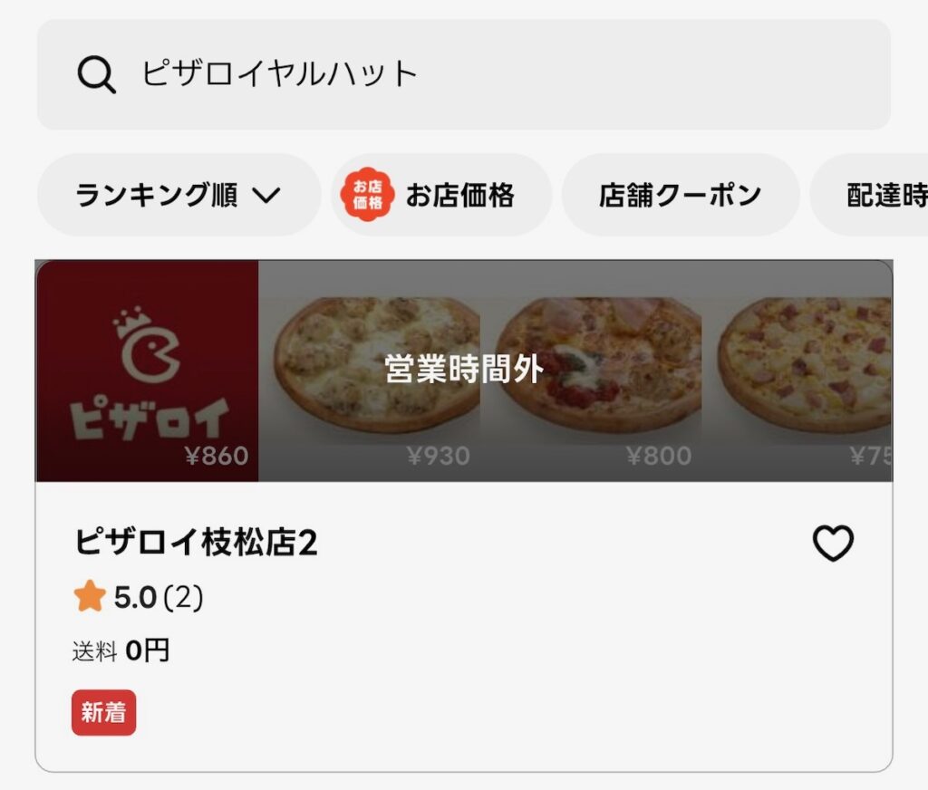 ピザ・ロイヤルハットはHITせず。代わりに表示されるのがピザロイ(後日スクショを撮ったので営業時間外になってます)
