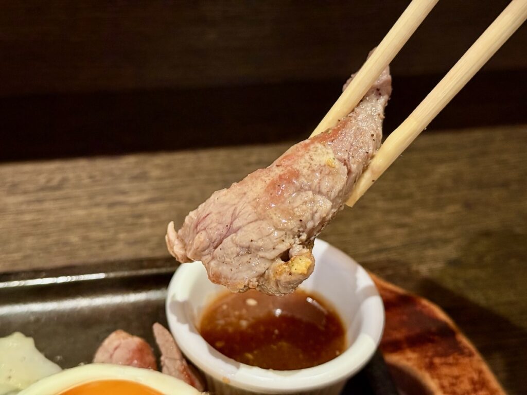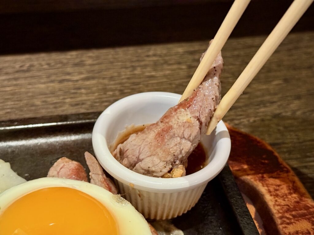 カットステーキというと、安いかわりにスジっぽさや硬さが残るものだと思う人も多いでしょう。でもここは違います。筋や余計な脂をきちんと外し、扱いやすい部位を選んでいるから、食べやすさと柔らかさが両立している。さらに鉄板で焼いたときに余計なドリップが出ないのも特徴です。これは仕入れと下処理の段階で相当気を配っている証拠ですよ。