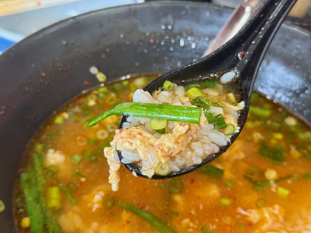 結構お腹いっぱいで、しかもスープも大量にあります。でも、カウンターで隣に座ってた人が〆の雑炊を頼んでいて、それがすごく美味しそうだったので・・・