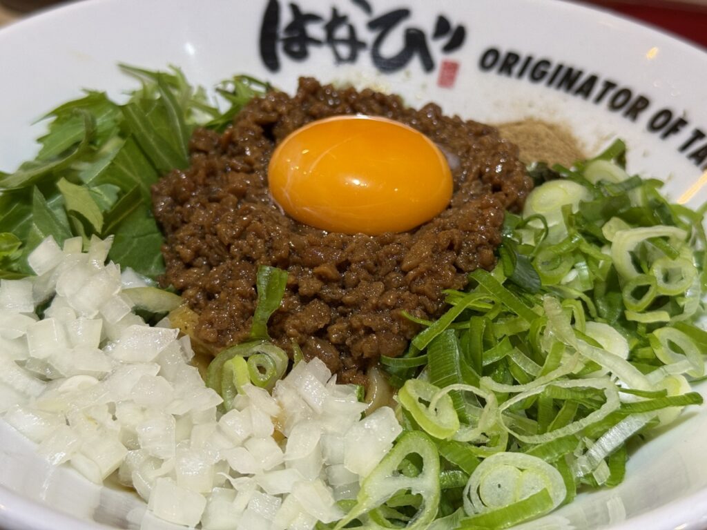 「台湾ミンチ」と呼ばれるピリ辛のひき肉、ネギ、ニラ、魚粉、卵黄などを麺に混ぜて食べる料理。